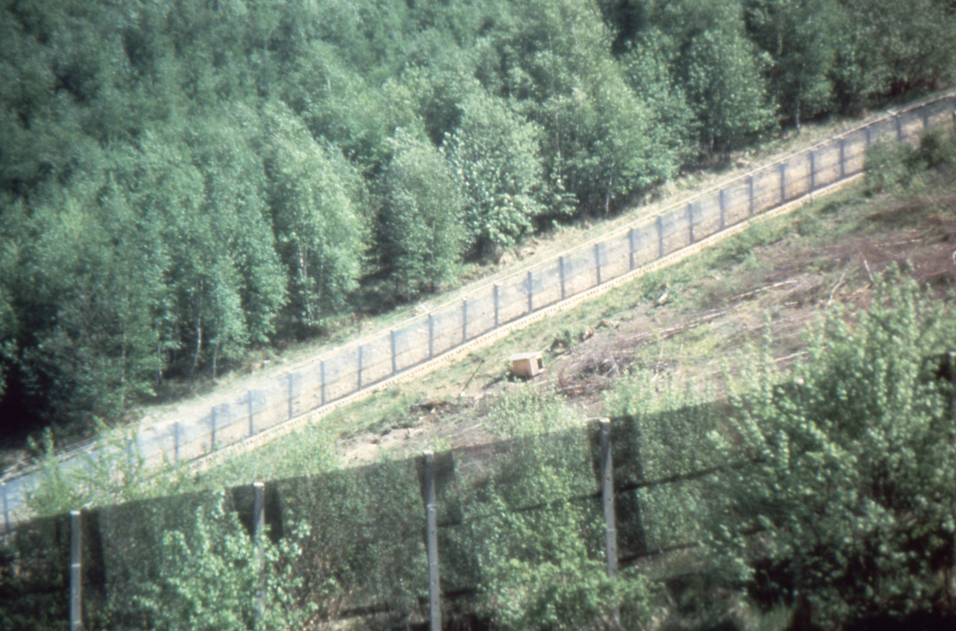 Vorn der 3,50 Meter hohe Grenzsperrzaun. Im Bildhintergrund die Sperranlagen entlang der Transitstrecke von und nach Berlin. (Foto: Manfred Ruppert) |