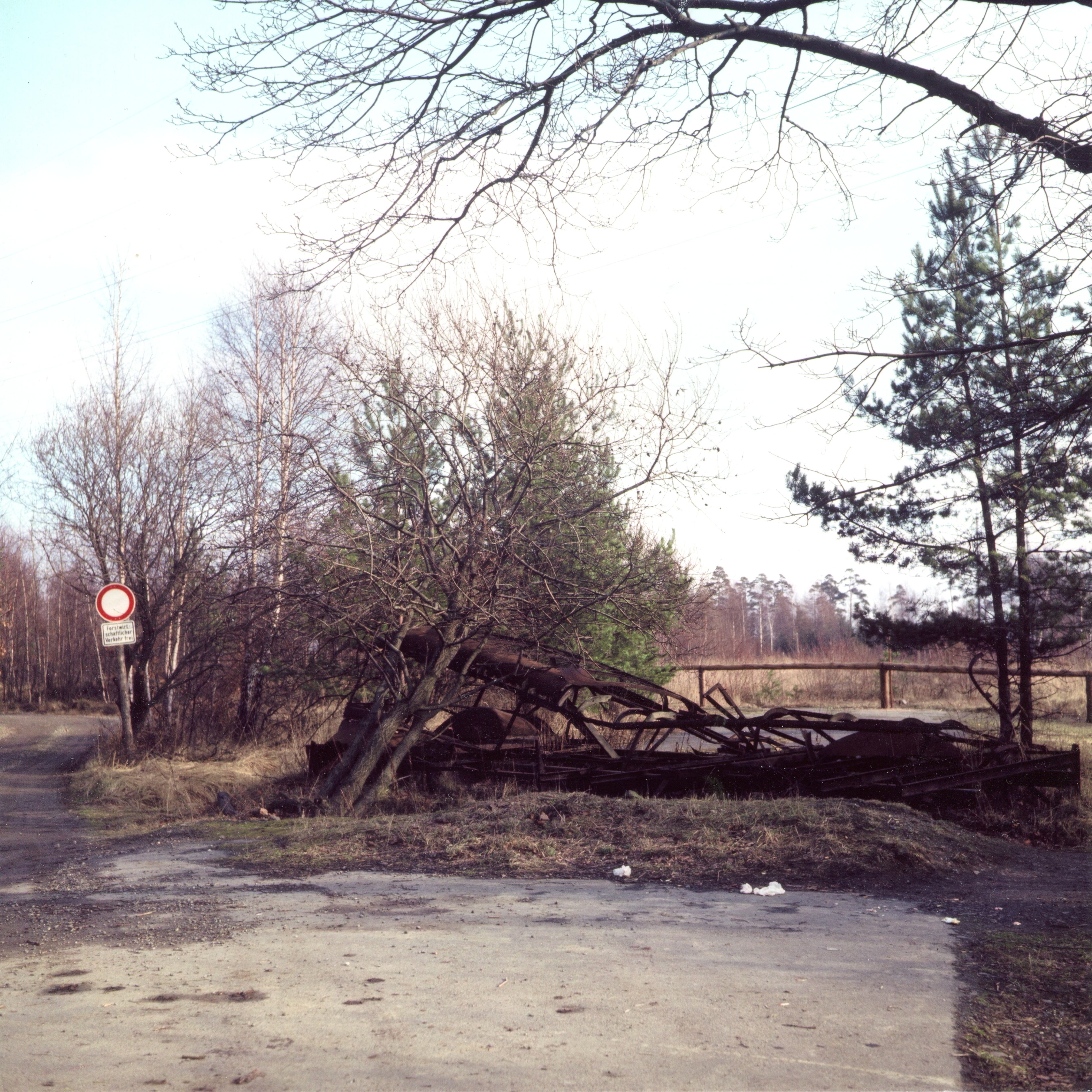 Blick von der Westseite des Grenzknicks Rabenbäume auf die DDR-Grenzsperranlagen mit dem 3,20 Meter hohen Metallgitterzaun aus Streckmetall und daran befestigten Splitterminen (SM 70). |