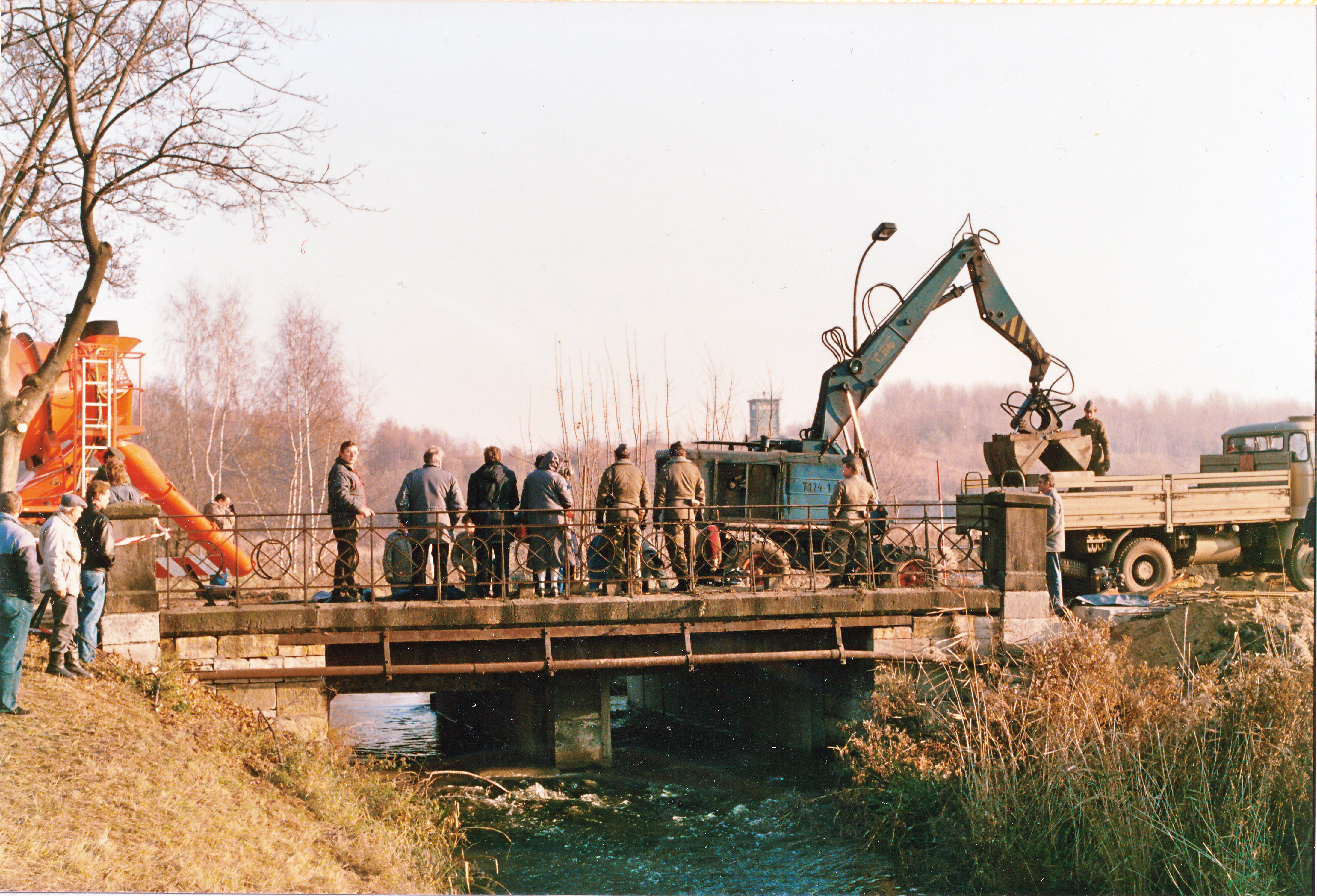 Erste Bürger aus Schöningen sammeln sich vor der Aue-Brücke am Fährturm. Ein Medienvertreter ist auf der Brücke bereits auf DDR-Gebiet vorgedrungen. Im Hintergrund ist der BTv4 auf der Hötenslebener Kippe zu erkennen. |