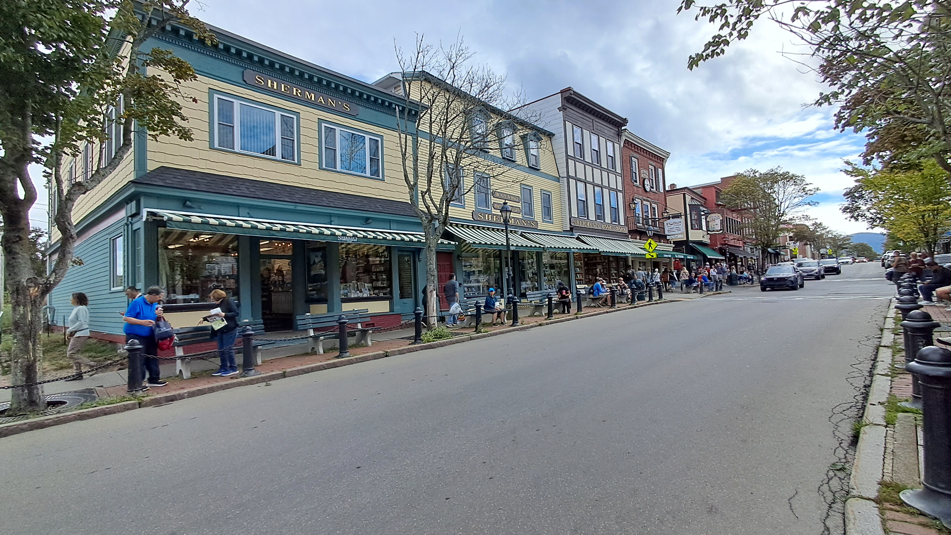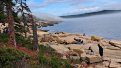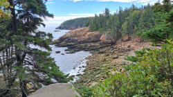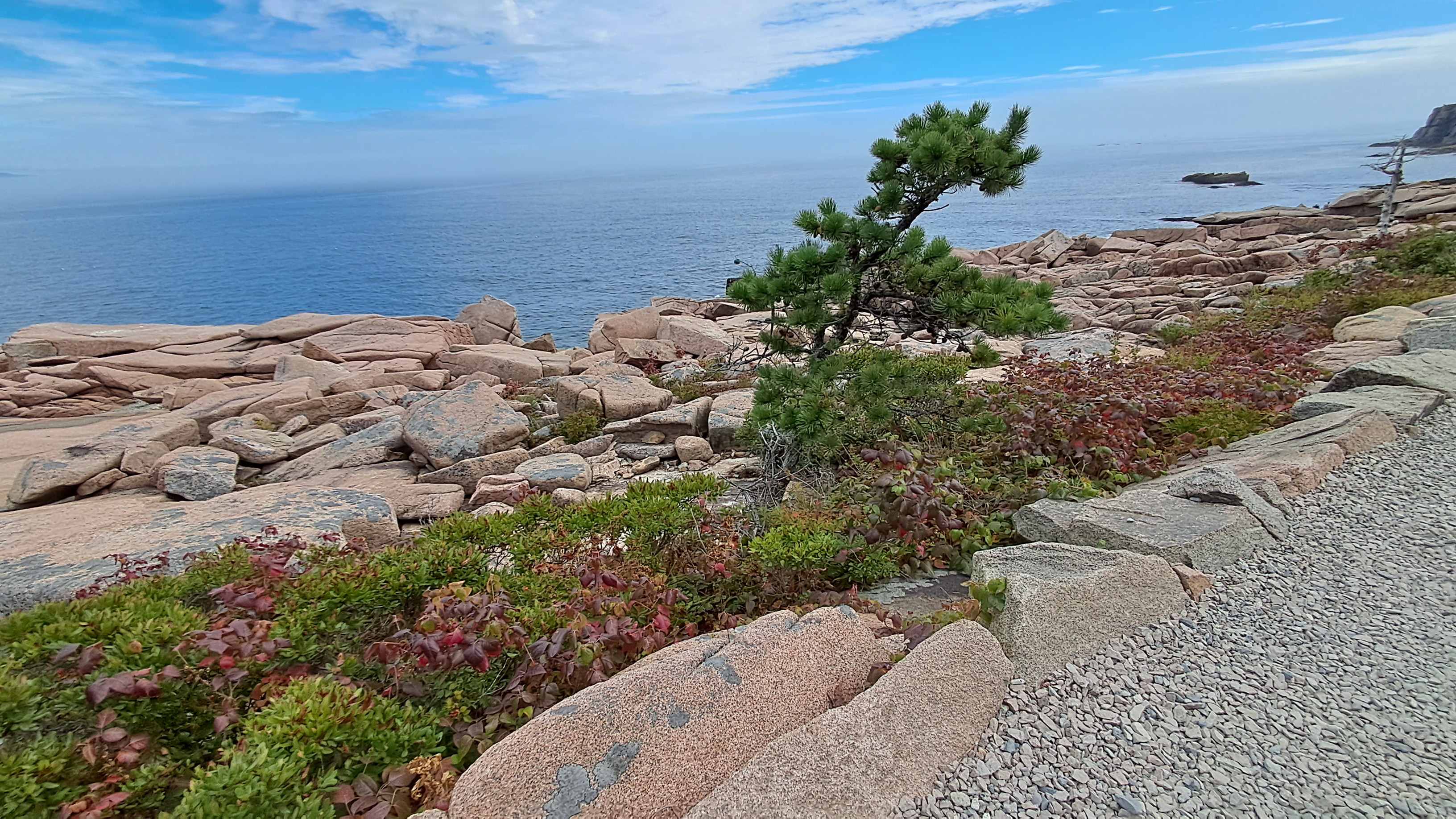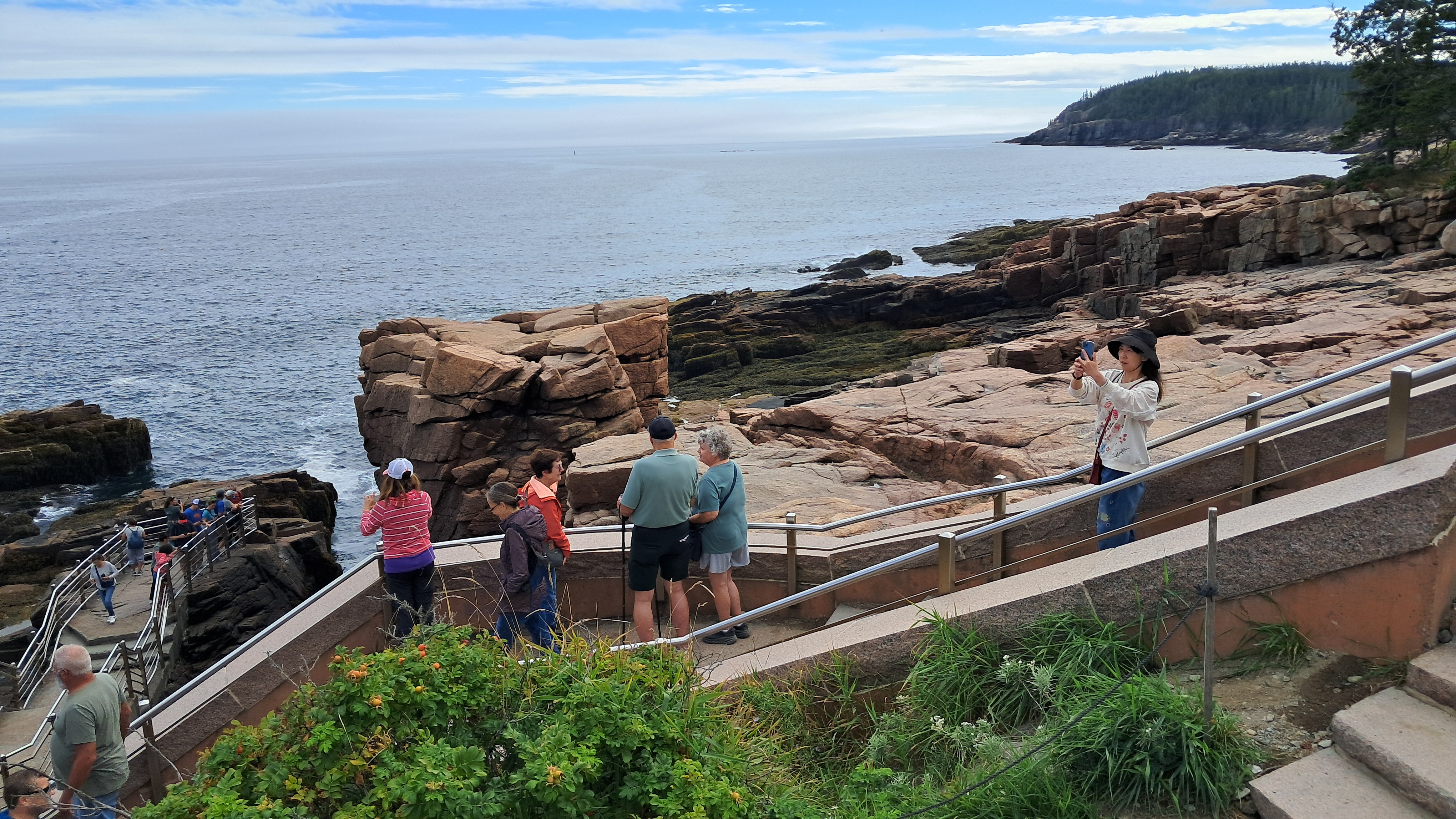 Donnerstag, 18.09.2025, Bar Harbor, USA (Maine) Bar Harbor, der vorletzte Ort unserer Reise, hatte ebenfalls keine Hafenanlegestelle, die groß genug war, dass Kreuzfahrtschiffe dort anlegen konnten. Es war also wieder tendern angesagt. Erste Tenderboote schafften noch die Fahrt nach Bar Harbor. Aber dann stoppte aufkommender Nebel die Ausschiffung der Gäste für gut eine Stunde. Bar Harbor ist eine quirlige bunte Kleinstadt mit maritimen Flair, die hauptsächlich vom Tourismus lebt. Die Umgebung mit dem südlich gelegenen Acadia National Park ist ein weiterer touristischer Anziehungspunkt. Neben dem Schlendern durch die Geschäfte haben wir auch das kostenfreie Shuttlebus-Angebot für eine Fahrt durch den Acadia National Park genutzt. Man kann an jeder x-beliebigen Haltestelle auf der Park Loop Road aussteigen, ein Teilstück des parallel verlaufenden Ocean Path entlang wandern und an einer der nächsten Haltestellen in den nächsten Shuttlebus wieder einsteigen.