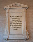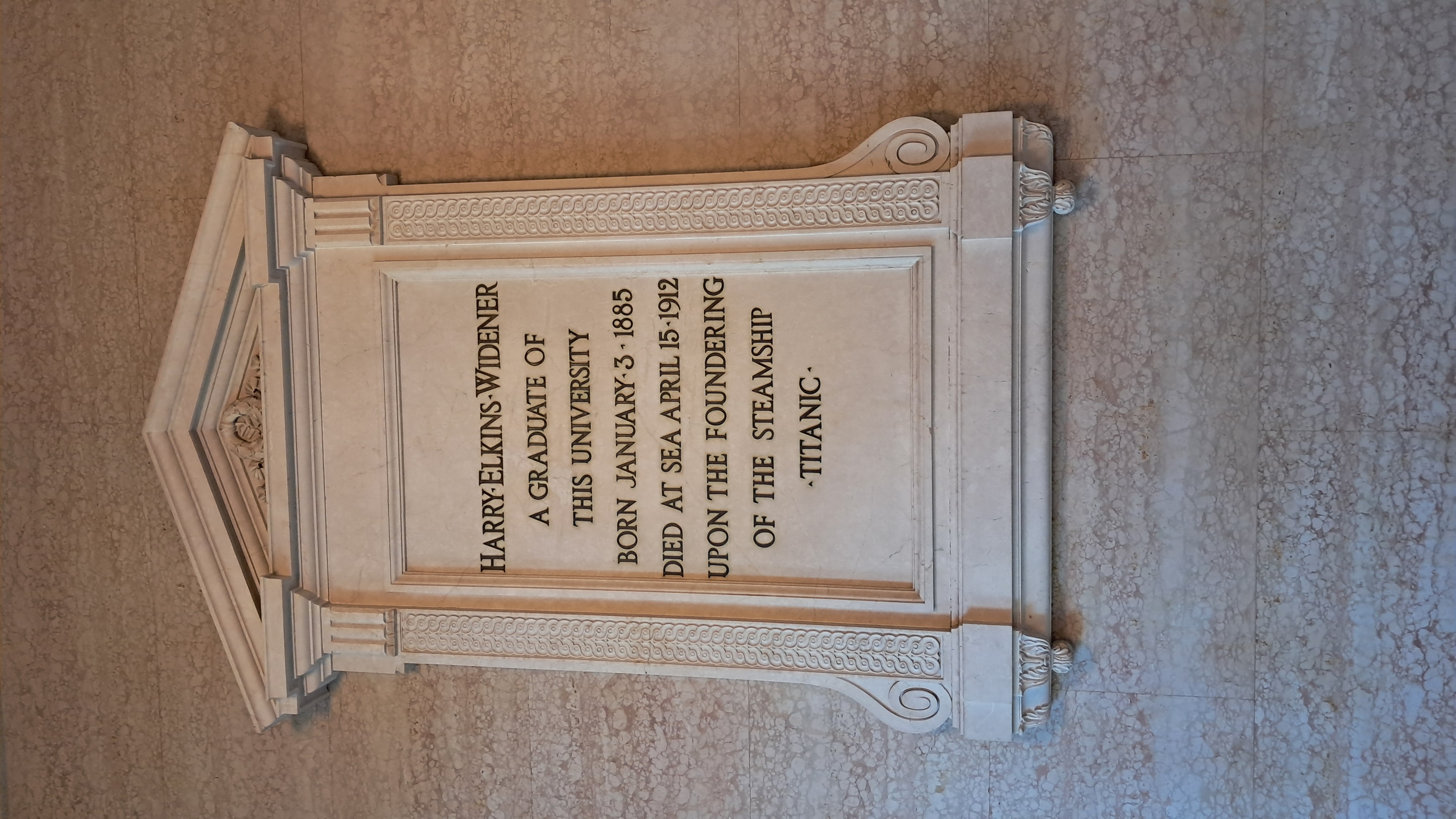 Gedenktafel im Eingangsbereich zur Bibliothek für Harry Elkin Widener, nach dem die Bibliothek benannt wurde. Harry E. Widener, der Harvard Hochschulabsolvent war, kam am 15. April 1912 bei dem Untergang der Titanic ums Leben. |