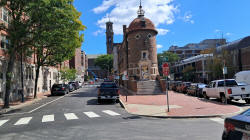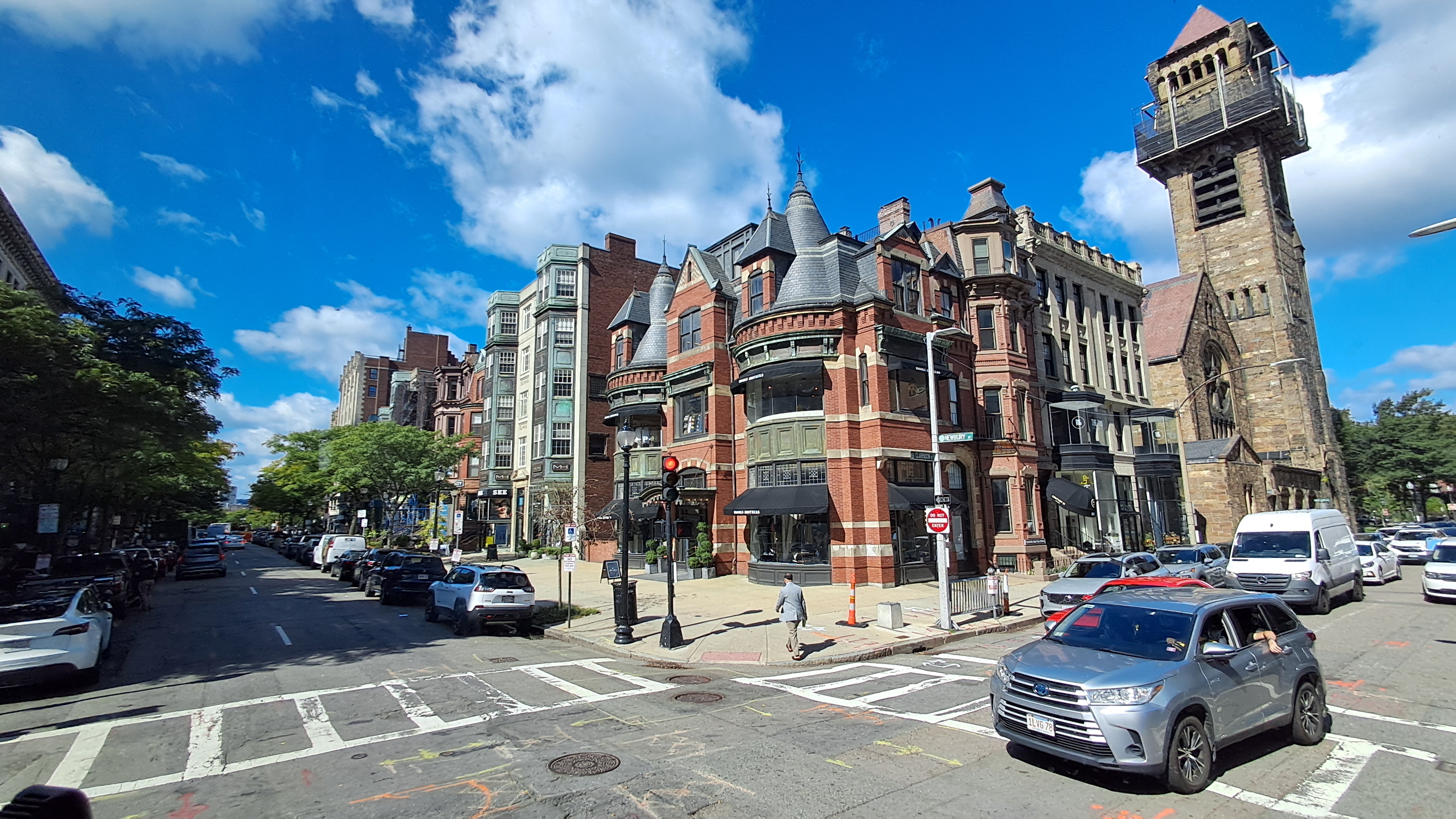 Rechts die First Baptist Church of Boston mit einem ungewöhnlichen (Glocken?)Turm. |