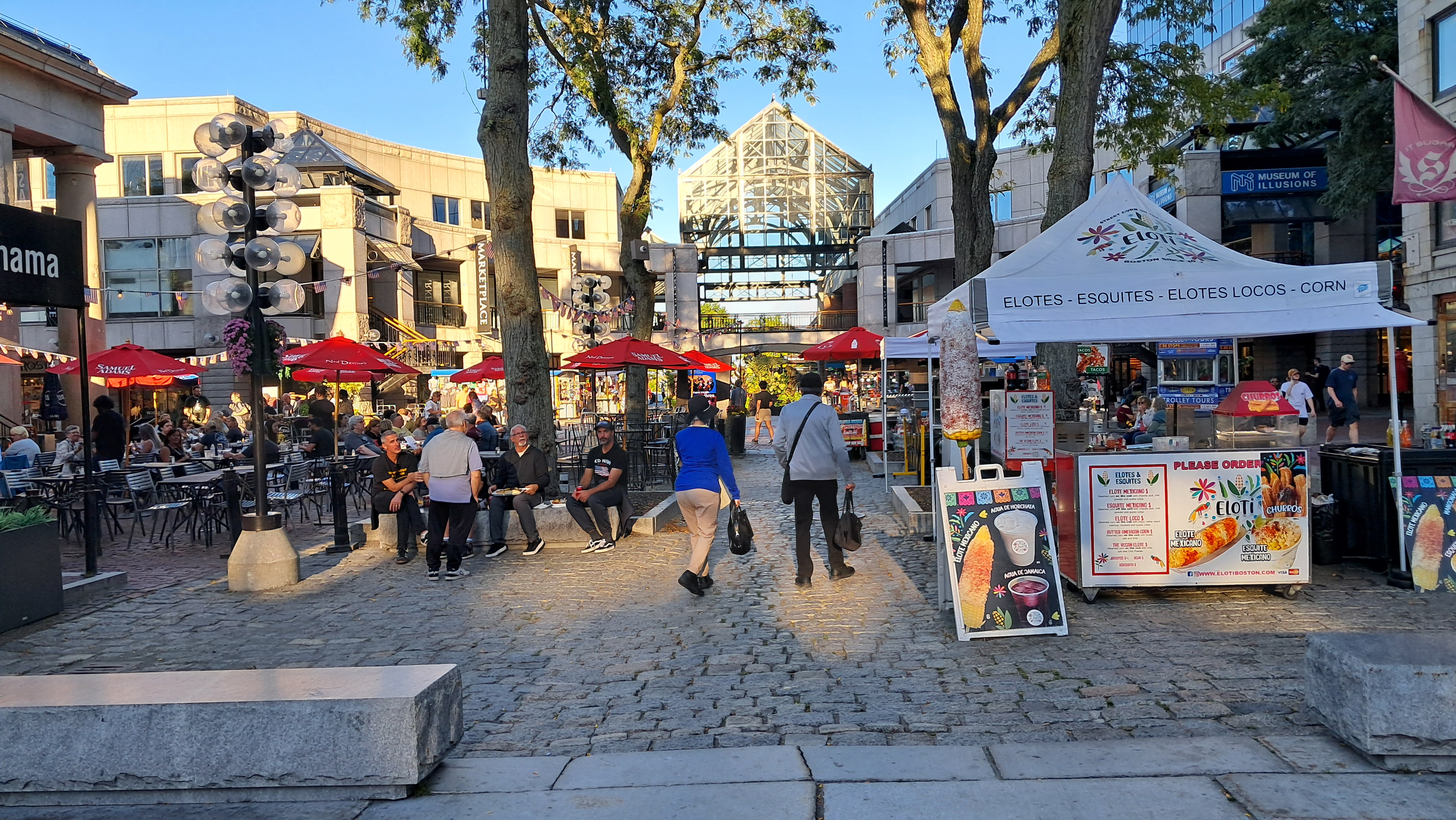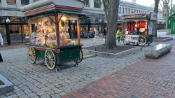 Solche Verkaufskarren sind ein typisches Erscheinungsbild für den Quincy Market. Wer möchte, kann sich auch auf eine historische Zeitreise begeben (re. Karren). |